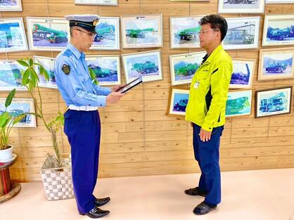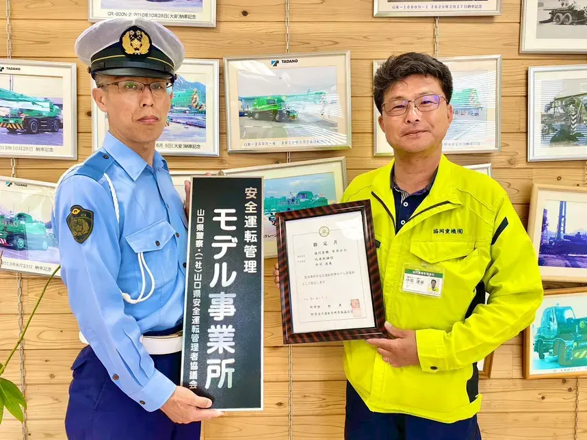 安全運転管理モデル事業所として指定されました! 2023年6月13日(火) 協同重機(有)が防府警察署長、防府安全運転管理者協議会により「安全運転管理モデル事業所」に指定され、6月12日昨日当社にて表彰式が行われました。防府安全運転管理者協議会会長より直々に表彰状と指定書、看板をいただきました。 今後も、モデル事業所として企業の模範となるような安全運転管理を社員一同努めます。